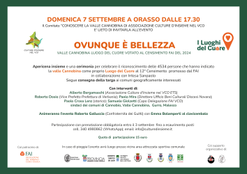 Il prossimo 7 settembre nell’accogliente piazza di Orasso in Valle Cannobina si festeggeranno i 4534 voti ottenuti nella 12° edizione del censimento dei Luoghi del Cuore Italiani da non dimenticare, promosso dal FAI - Fondo per l'Ambiente Italiano.