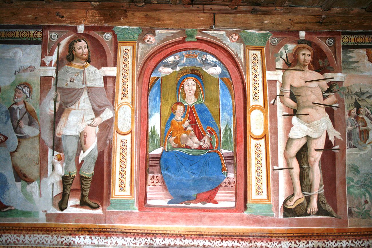 La costruzione più antica viene fatta risalire alla iniziativa di Giovanni Generello che lo edificò nel XV sec. incorporando una più antica cappella devozionale, come ex voto per la guarigione dalla peste. Sorse come “Cappella di S. Maria del Sasso”. Nel 1574 Carlo Borromeo in occasione della sua visita pastorale diede “ordini” e indicazioni per ampliarla e farne un vero Oratorio (1). L’Oratorio è dedicato alla Madonna della Cintura, protettrice dei viandanti, rappresentata all’esterno e sopra il portone d’entrata. Pregevole l’affresco del pittore craveggese Mattia Borgnis (1701-1761) (2). All’interno il tipico soffitto a “cassettone romano”, il pavimento in pietra e diversi affreschi del pittore vigezzino Francesco Balconi (1604): la Visitazione, S. Rocco, S. Sebastiano, il Battesimo; e del pittore di scuola lombarda Antonio da Tradate (fine XV inizio XVI): Madonna in trono con Bambino al centro dell’abside. Nel 1665 vi si eresse la confraternita della Madonna della cintura. Di fronte il pronao una scalinata in cima alla quale si innalza una colonna rogazionale del XVIII sec. L’Oratorio e i suoi affreschi (3) (4) sono stati oggetto di recenti interventi di restauro. E’ stato inoltre riconosciuto e premiato dal FAI (Fondo Ambiente Italiano) quale “Luogo Del Cuore FAI” in occasione della 6° edizione (2012) del censimento dei luoghi italiani da non dimenticare
