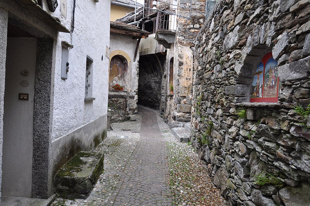 Lobbie in legno, tetti in piode, case con muri in pietra tra cui appaiono alcune case accuratamente ristrutturate caratterizzano Orasso (dal latino Oratio, terra di preghiera) (9) (10).