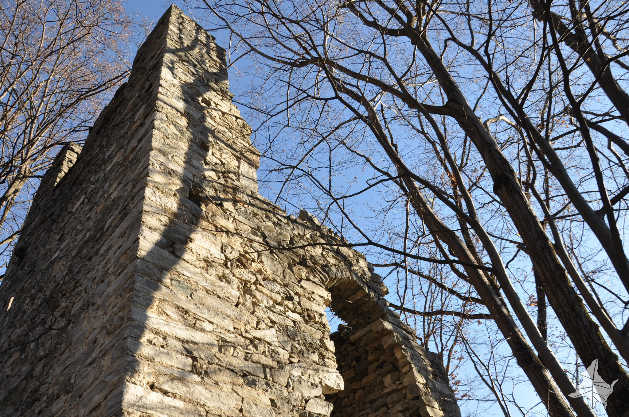 Nascosto alla vista da un fitto bosco e per una questione di prospettiva lungo il ripido sentiero che porta alla cima di una collinetta dove è collocato, ti appare all’ultimo momento quando pure tiri un sospiro di sollievo, perché è conferma che non hai sbagliato strada. Ma anche allora pare nascondersi. Il grigio delle pietre murali, complice la luce del tardo pomeriggio si confonde col grigio dei tronchi di altissimi faggi che sembrano competere in altezza col castello.