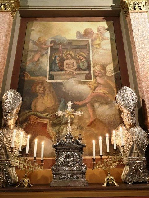 Dopo la cerimonia dell’accoglienza della Sacra Costa la celebrazione si è svolta nella bella chiesa di San Lorenzo. Le panche dei fedeli sono state posizionate di fronte alla cappella laterale dove sopra l’altare vi domina un affresco dedicato proprio all’icona della SS. Pietà di Cannobio, dipinta negli anni 1930 dal pittore Mario Abertella.