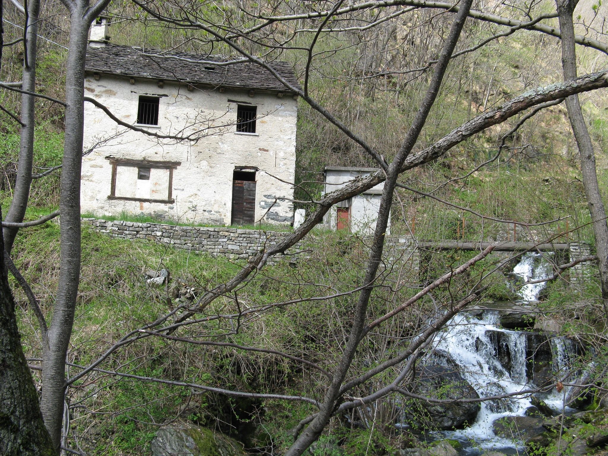 Sul fondo della valletta appare un edificio a due piani: un vecchio mulino a suo tempo azionato dall’acqua del torrente Eira (rio Mulini).